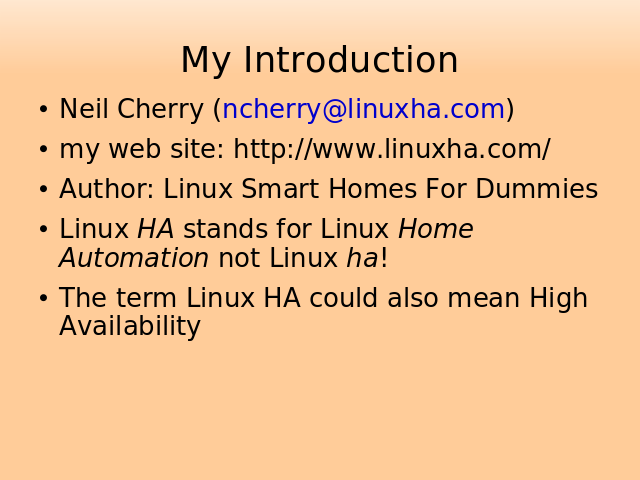 I'm Neil Cherry and I'm here to talk to about Linux and Home automation. I've been in computers since 1978 when I took a computer course in high school. I purchased my first computer, an Atari 800xl and a tape drive in 1985. I had been using a local community college's PDP8 and Vax until then. My first home automation system was my 800xl and a Heath kit X10 transmitter interface. My next computer was 2 AT&T Unix PCs with a 1Mbps Starlan network. The X10 transmitter was move to that machine. I've been working with Linux since Linux kernel 0.95 came out. My first machine was an AT&T 6386sx 16Mhz 16M of RAM and an 80 Meg hard drive. I've run the Linux Home Automation web site since 1995.