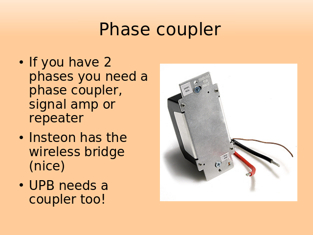- Any system that uses the power line to communicate and has to deal with 2 or more phases has to have a way of coupling the phase so signal can be sent on one side and reach the other. This is true of X10, Insteon and UPB. Z-Wave does not use the power line to communicate, it uses wireless signals.