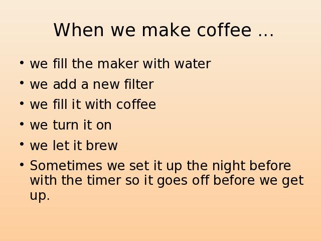 Even something as simple as filling the pot with the correct amount of water requires smaller steps. Oh and if you are explaining this to your spouse may I recommend that you don't use the toilet float to explain how the pot fills with water. The analogy doesn't work well. ;-)