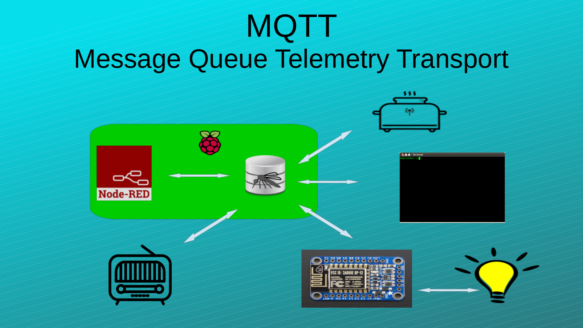 1. Impress (this presentation software) executes a script that tells Node-Red to coordinate the conversation between the toaster and radio using MQTT topics to communicate with the toaster and radio.